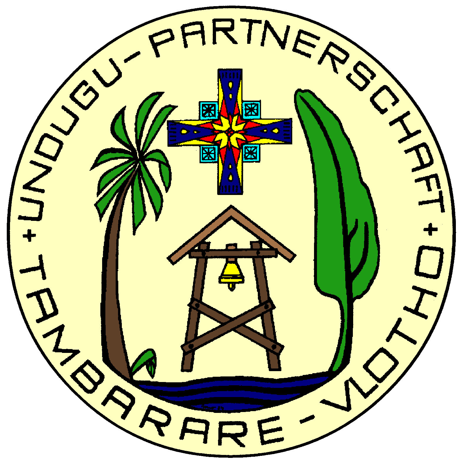 Das Symbol unserer Partnerschaft zeigt eine afrikanische Palme und eine deutsche Pappel, die aus der gleichen Quelle leben: Jesus Christus. In der Umschrift erscheint das Wort „Partnerschaft“ und die Übersetzung in Swahili „Undugu“.