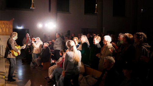 Bittlinger, mit dem für ihn zum Markenzeichen gewordenen Stoppelbart, aber im einfachen Sakko, bietet im Altarraum ein Bild irgendwo zwischen bühnenerfahrenem Liedermacher und Gemeindepfarrer. Routiniert bringt er sein Publikum schon mit den ersten Liedern wie dem spielerischen „Aufgeräumt“ zum Mitsingen. Seine „Spielkameraden“ David Plüss und David Kandert begleiten multiinstrumental, ohne sich in den Vordergrund zu drängen. Immer wieder zieht es Bittlinger in sein Publikum. Aus dem Mittelgang feuert er zu seinem Statementsong „Wenn es nicht deins ist“ die Menschen in den Bankreihen an, lauter gegen Populismus zu werden. Bittlinger weiß, was ankommt: mit „Sternenstaub“ aus seiner Astrophysik-Kollaboration bringt er das nächste Mitsing-Highlight. Einen kurzen Moment der Ruhe nutzt er, um auf seinen ersten Roman „Im Kreis der 12“ zu verweisen, bevor er mit seinem Klassiker „Aufstehn, aufeinander zugehn“ das ganze Publikum wieder von den Bänken reisst und zum Mitsingen bringt.