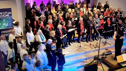 Der A-Capella-Chor Mehrklang präsentierte sich wie gewohnt vielstimmig unter der Leitung von Elisabeth Markus und brillierte mit besonderen solistischen Parts. Ausgiebiger Beifall belohnte ihren Auftritt, bevor die Zwischentöne und Rehmissimo gemeinsam mit achtzigen Sängerinnen und Sängern den afrikanischen Gospelsong „You are the Light“ mit Perkussion, Gitarren und Piano stimmungsvoll performten. Abschließend stimmten alle gemeinsam mit den Besuchern das irische Segenslied „Möge die Straße uns zusammenführen“ ein.
